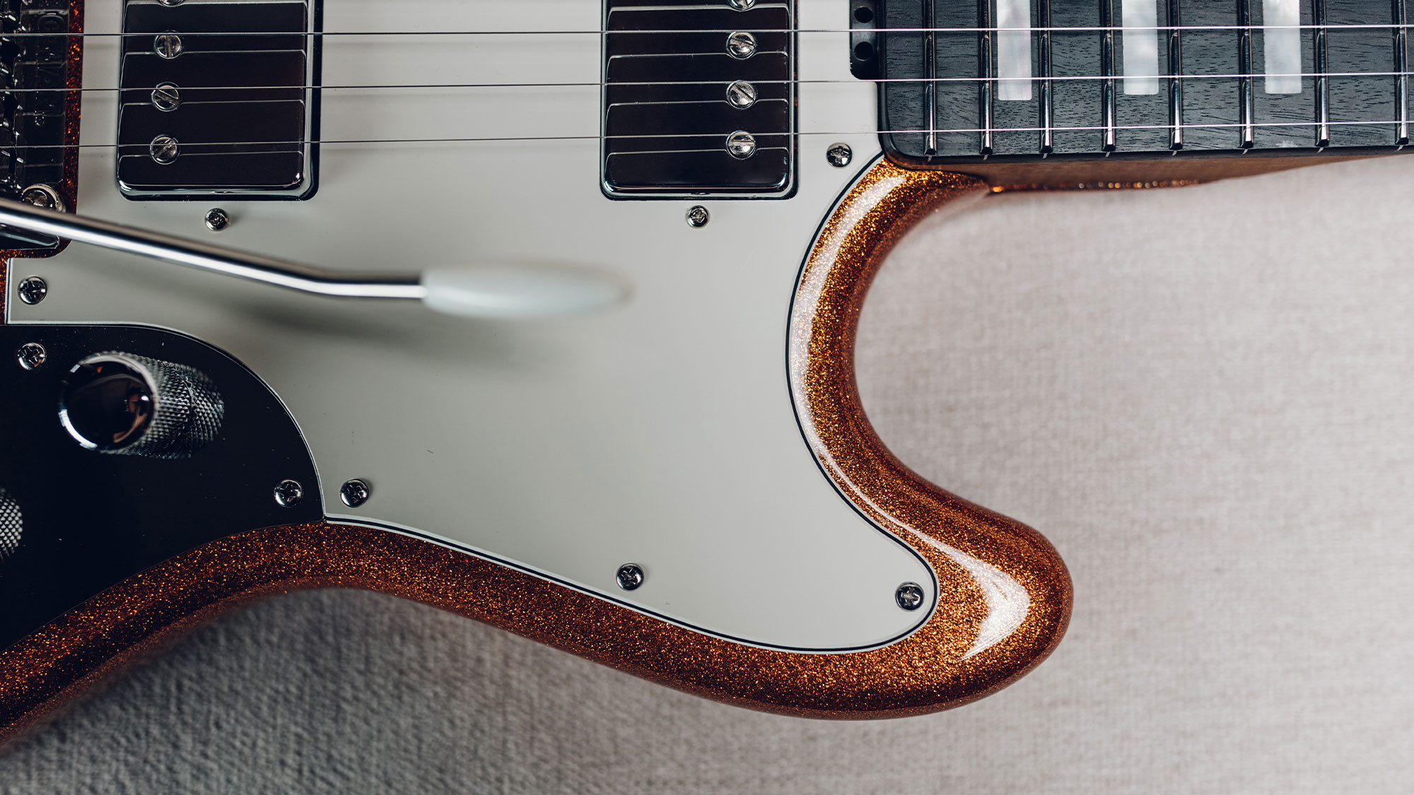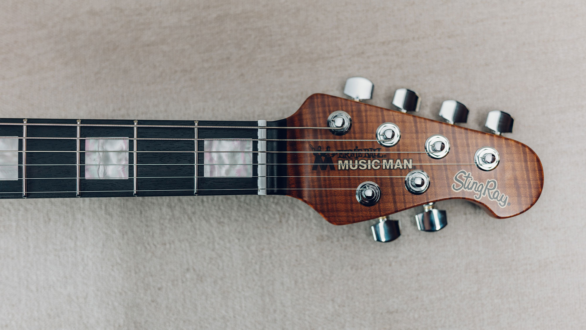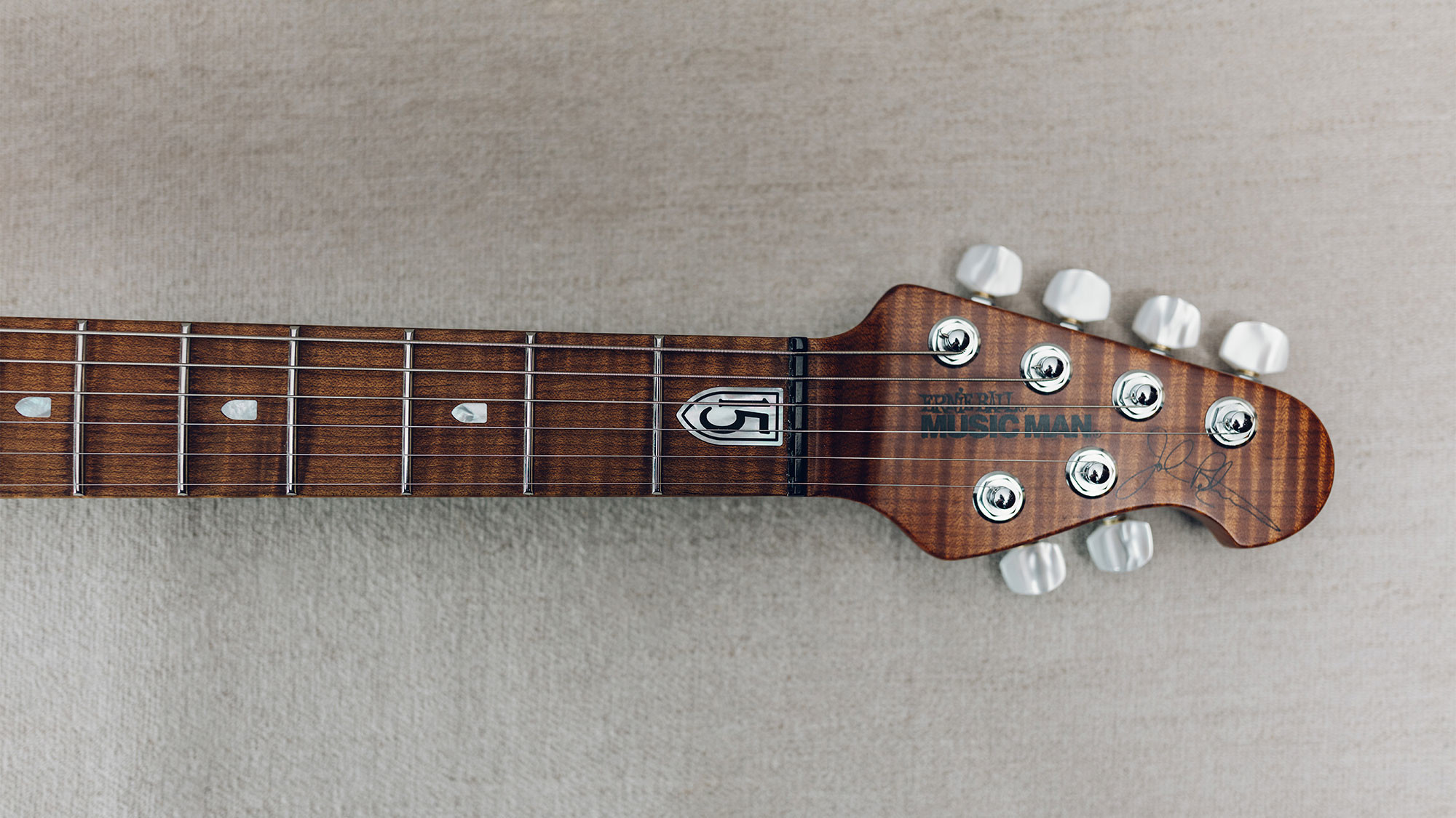 Two strips of pearl inlays replaces the custom STV fret markers.