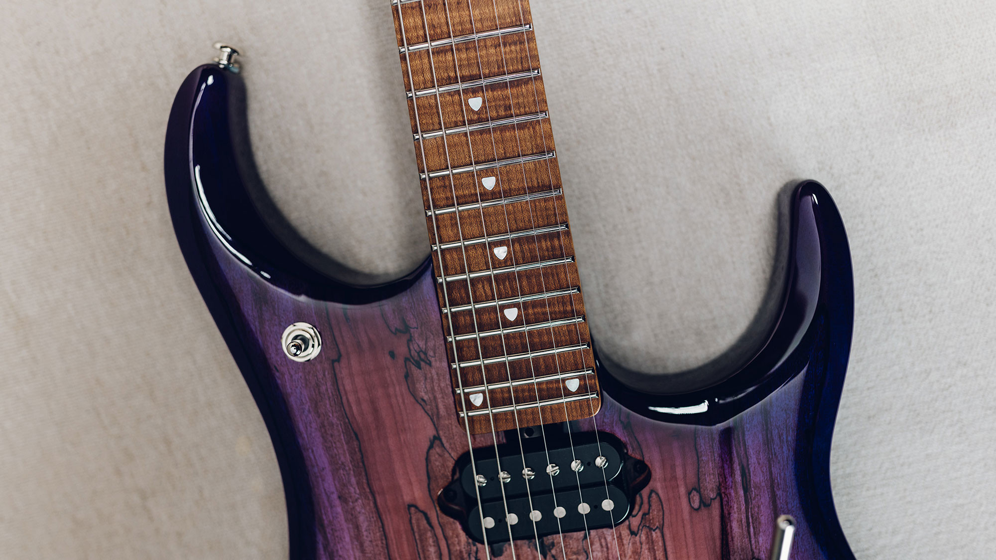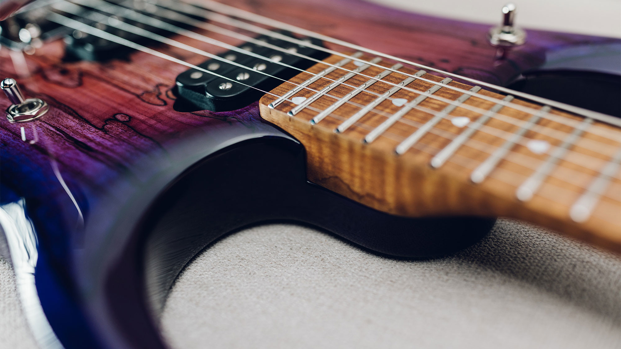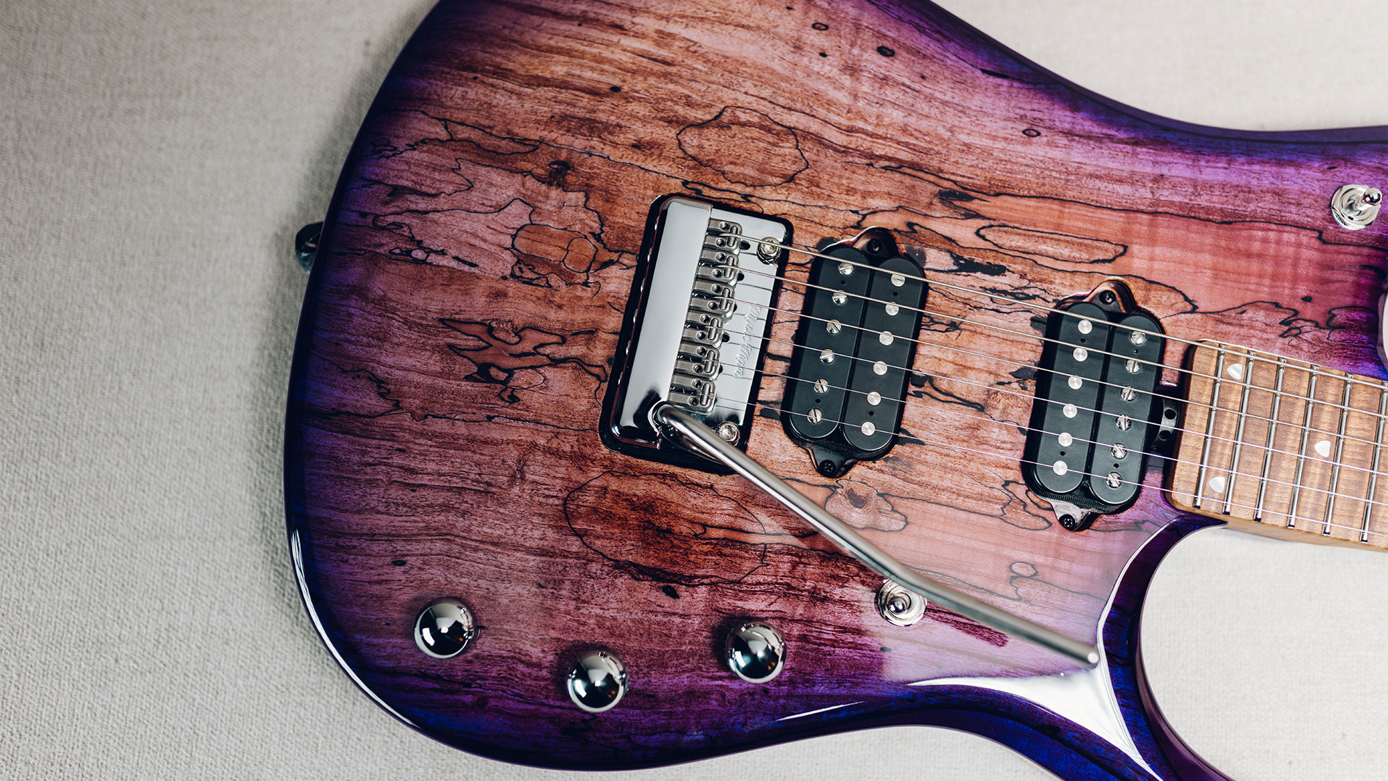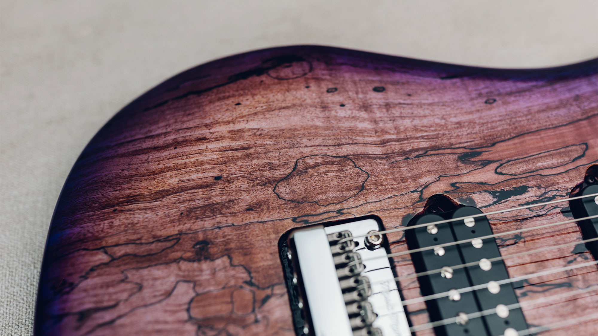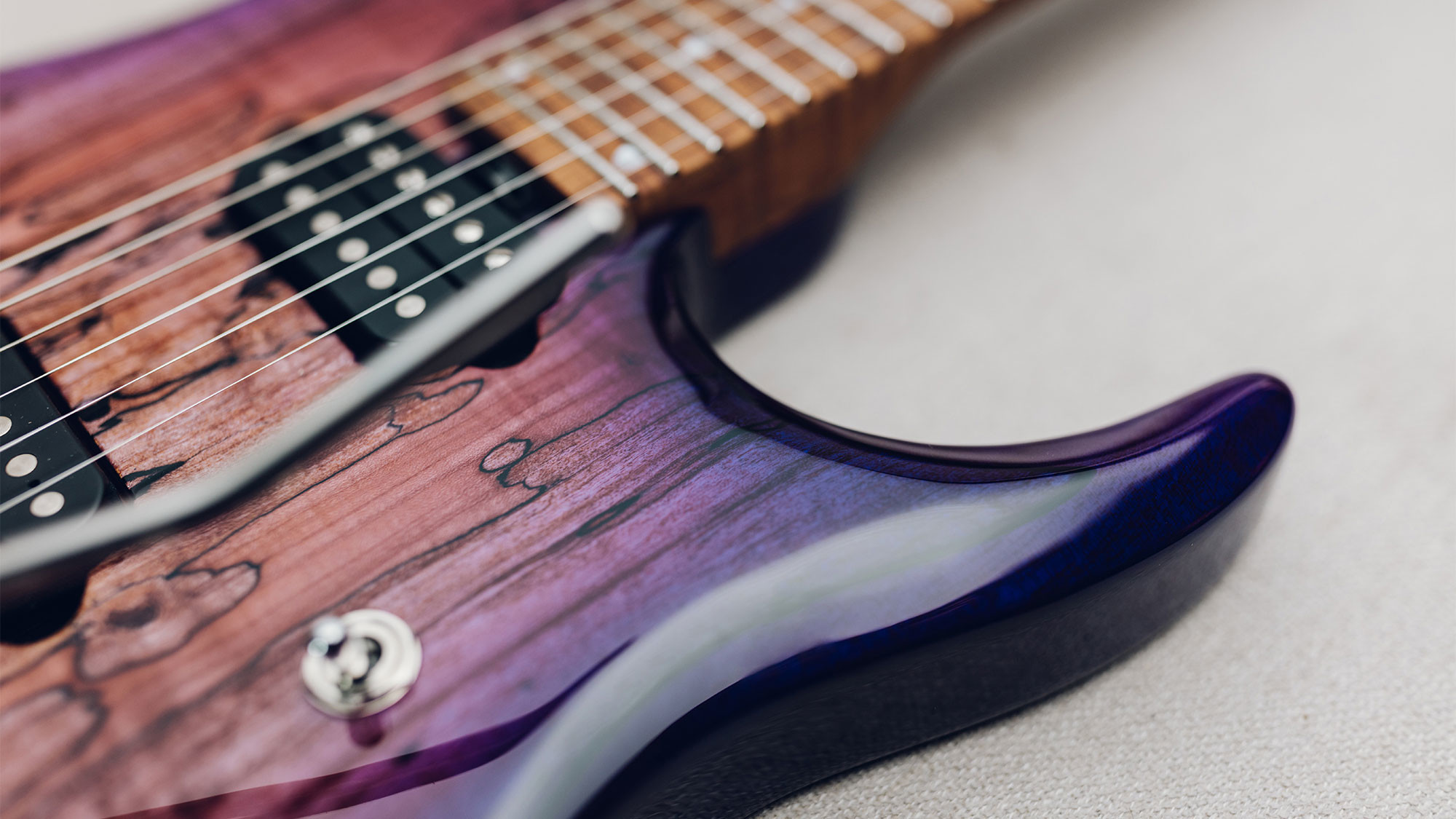 Spalted maple top in a custom Purple Sunset finish, with a translucent purple finish on the back.