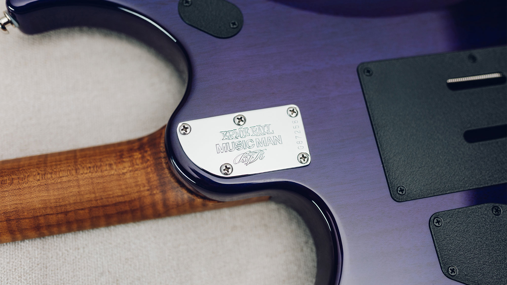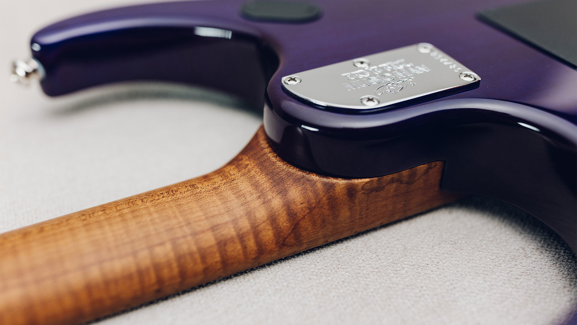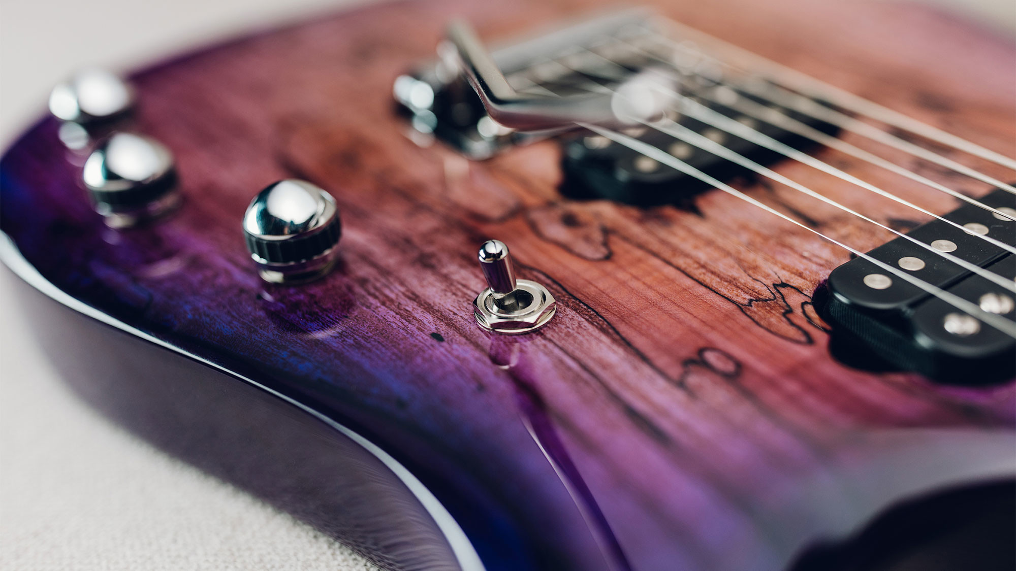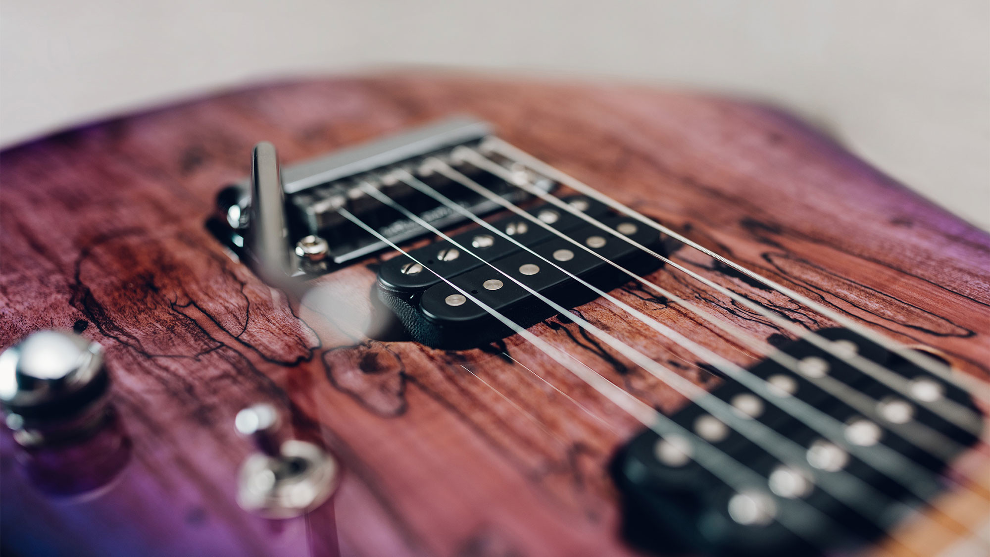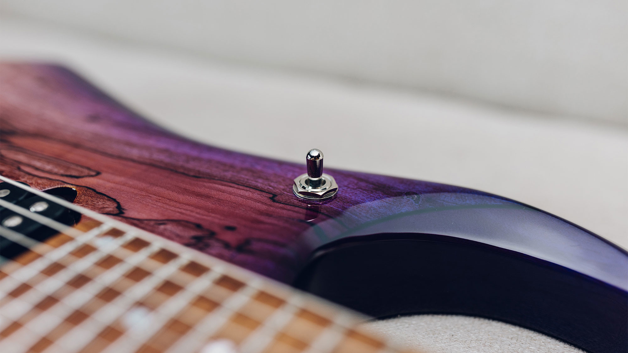 Spalted maple top in a custom Purple Sunset finish, with a translucent purple finish on the back.