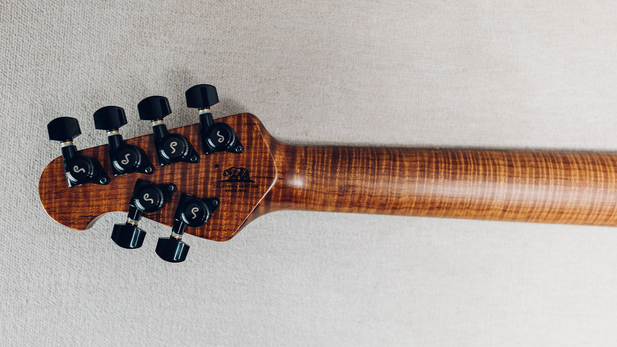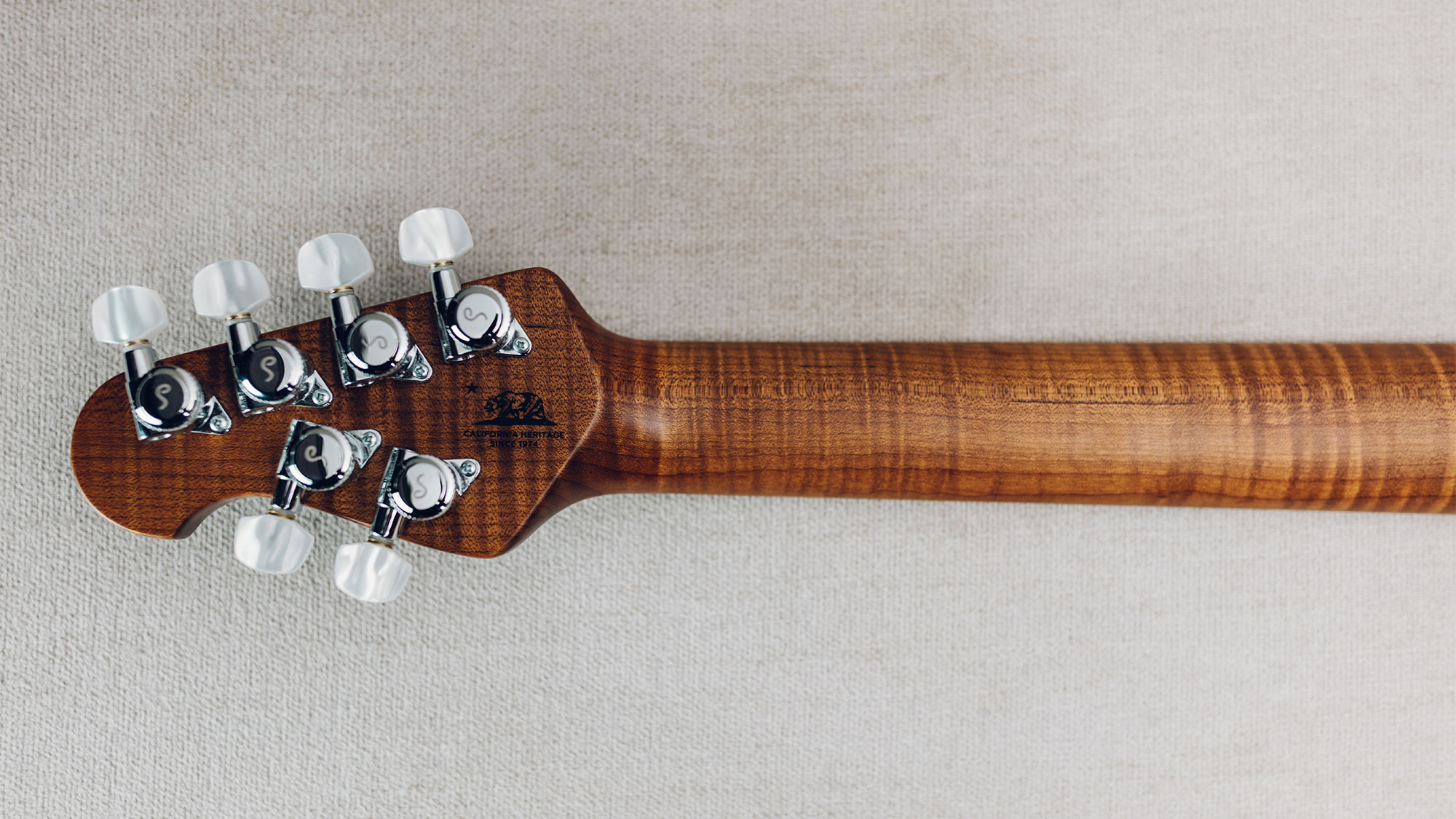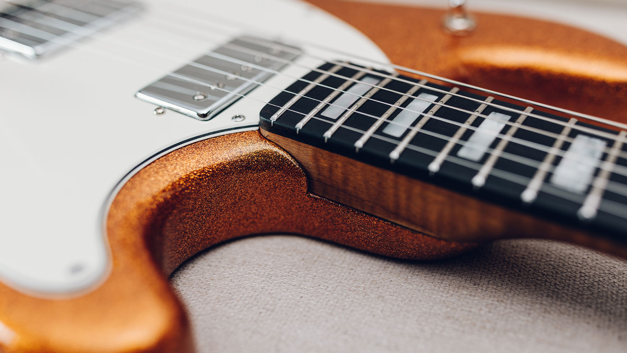 Figured roasted maple neck and fingerboard with white shield inlays.