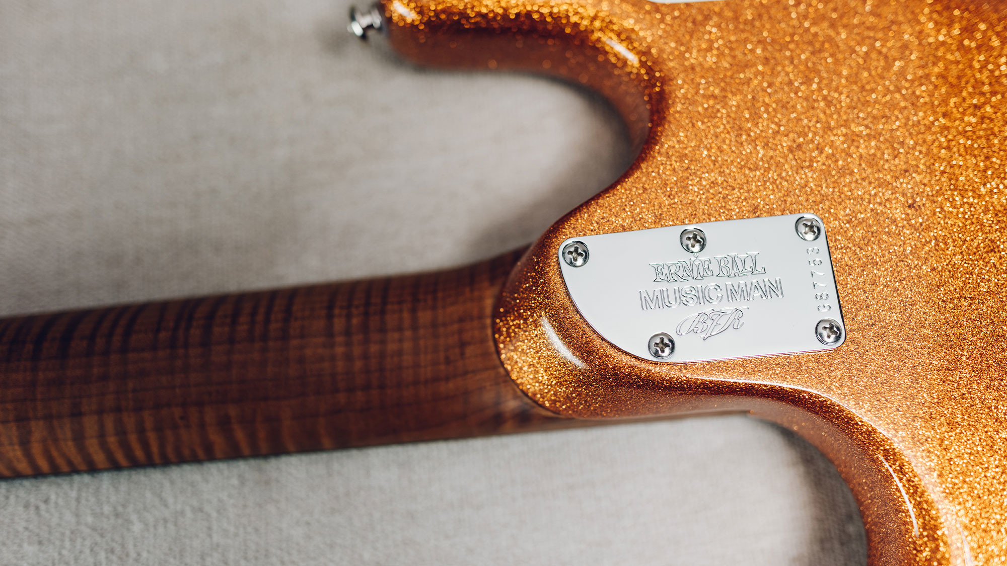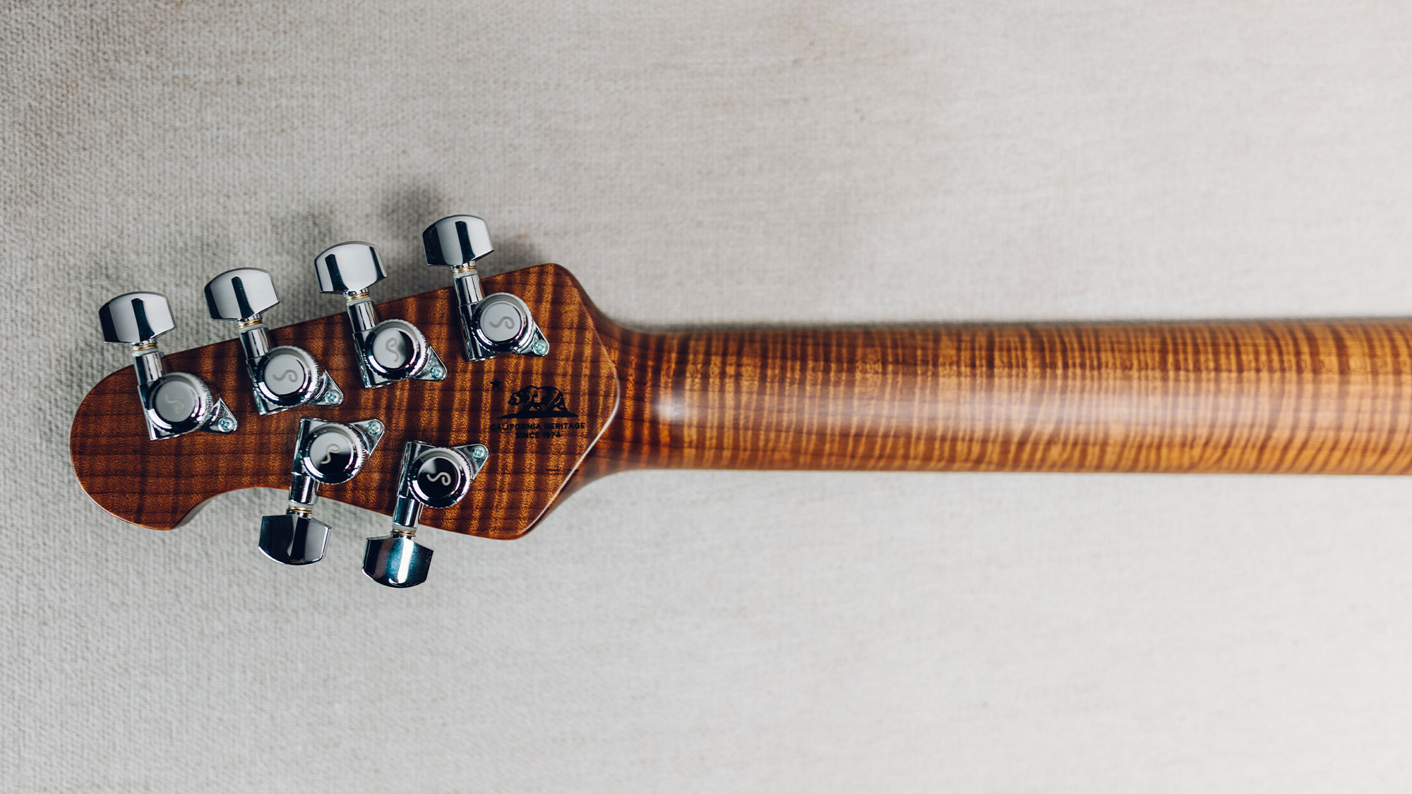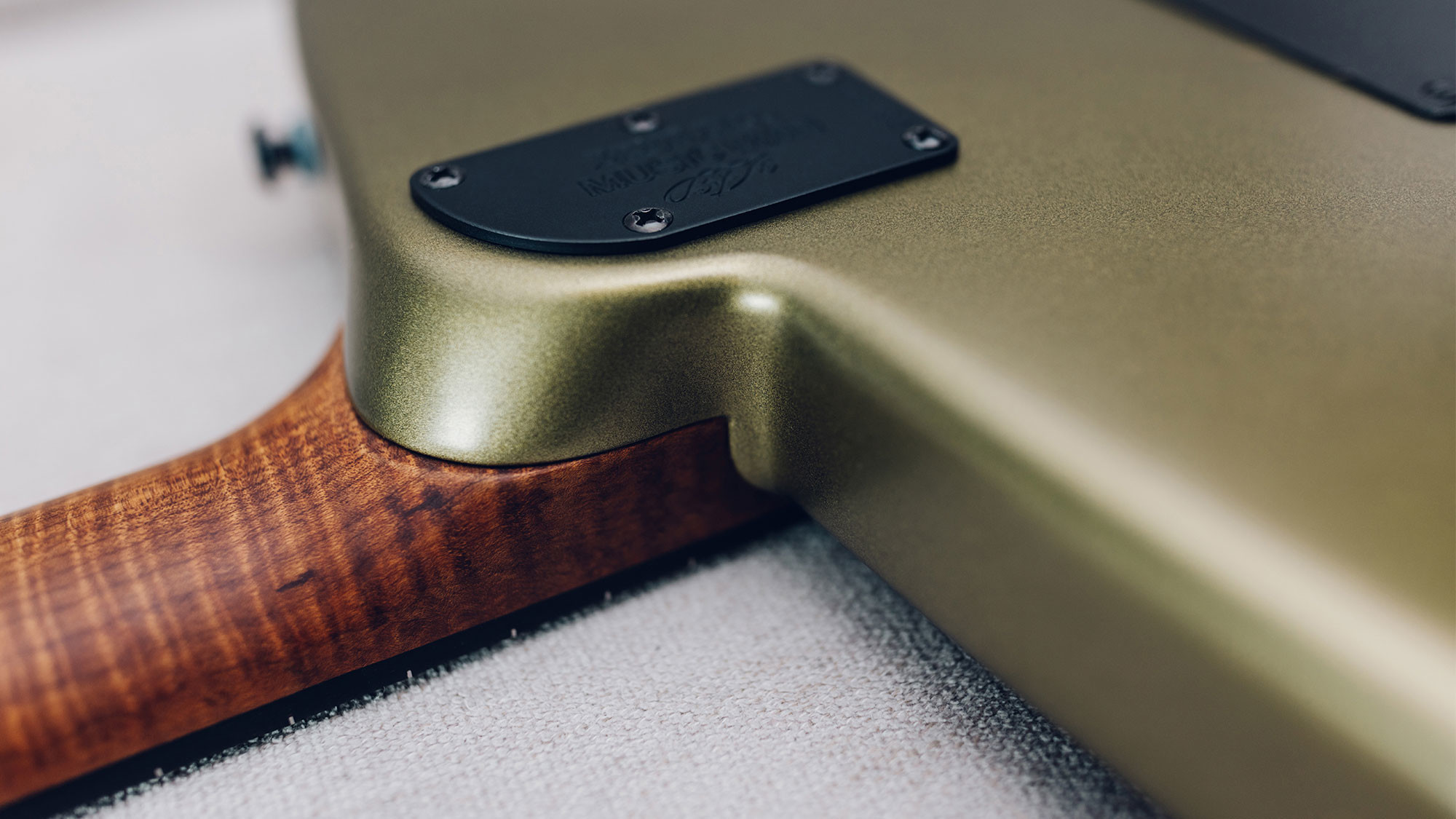 Figured roasted maple neck and fingerboard with white shield inlays.
