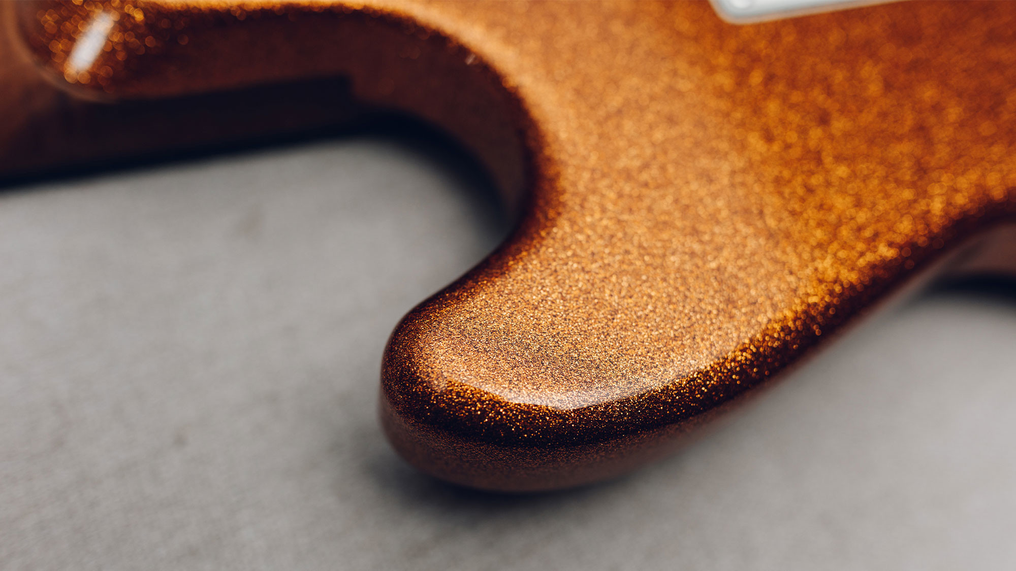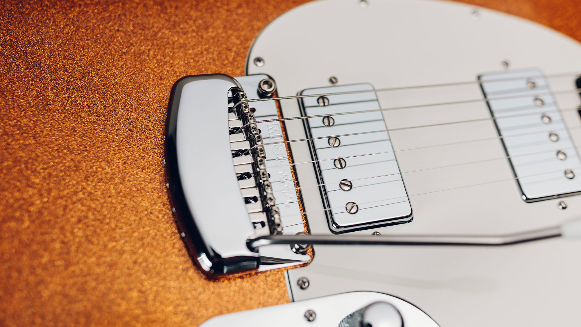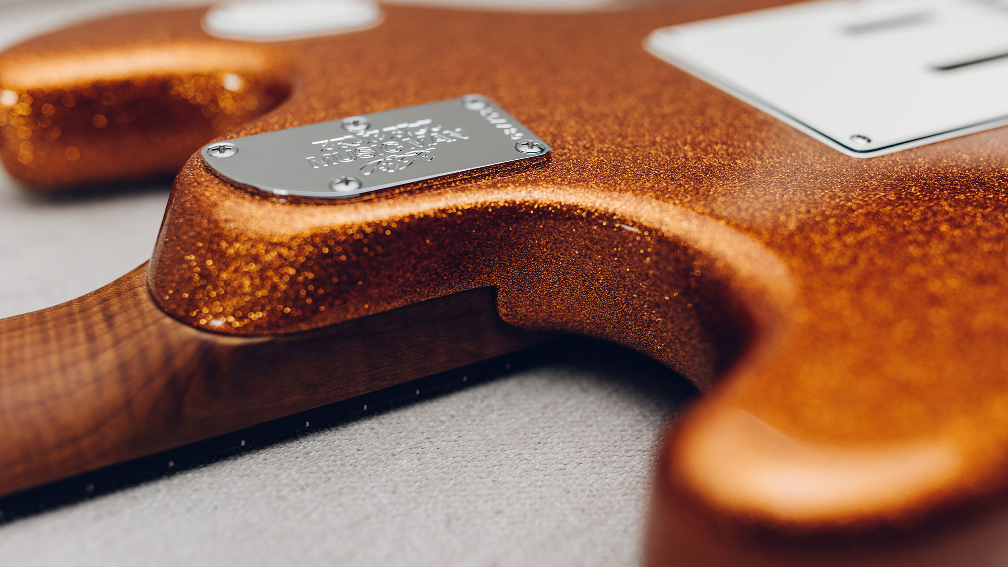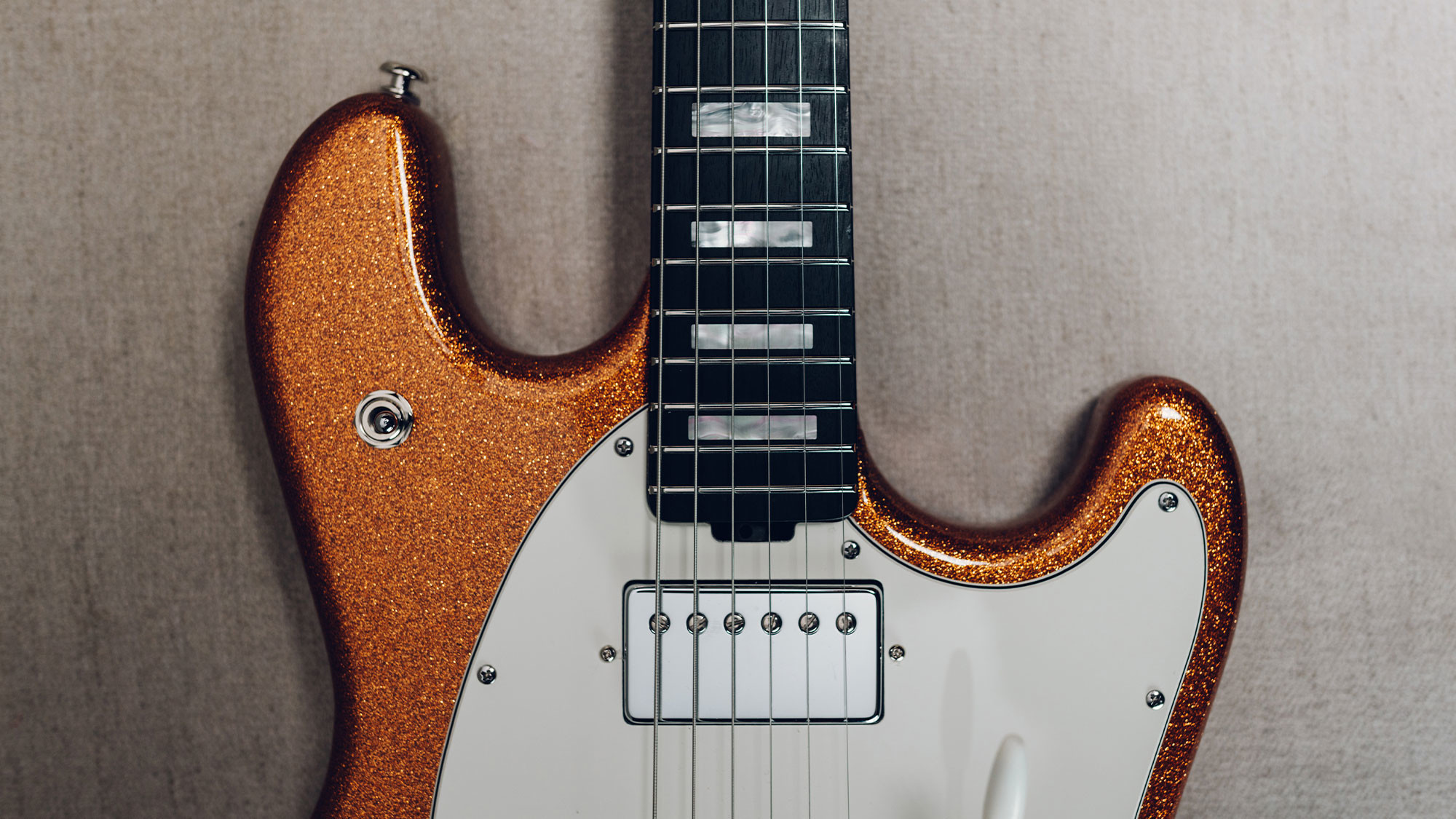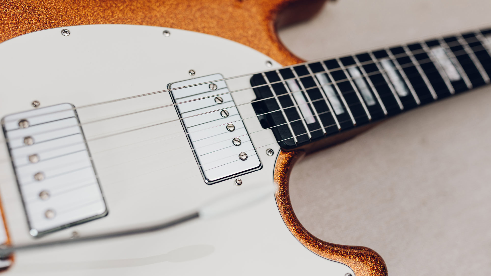Dual humbucking light weight Okoume body with exclusive Atomic Orange sparkle finish.